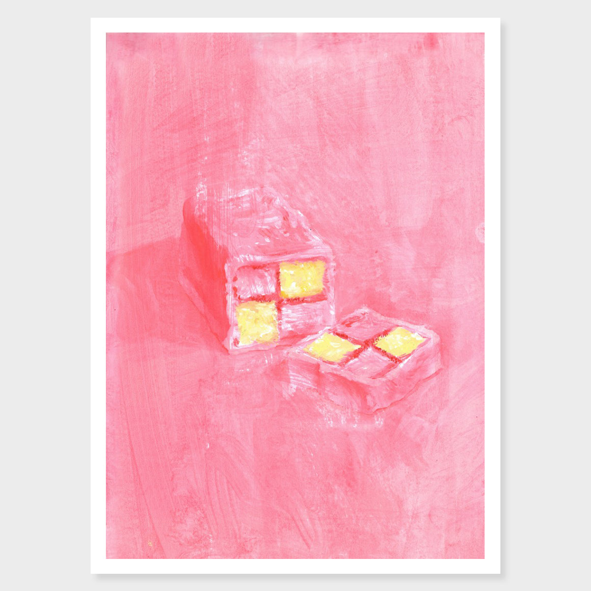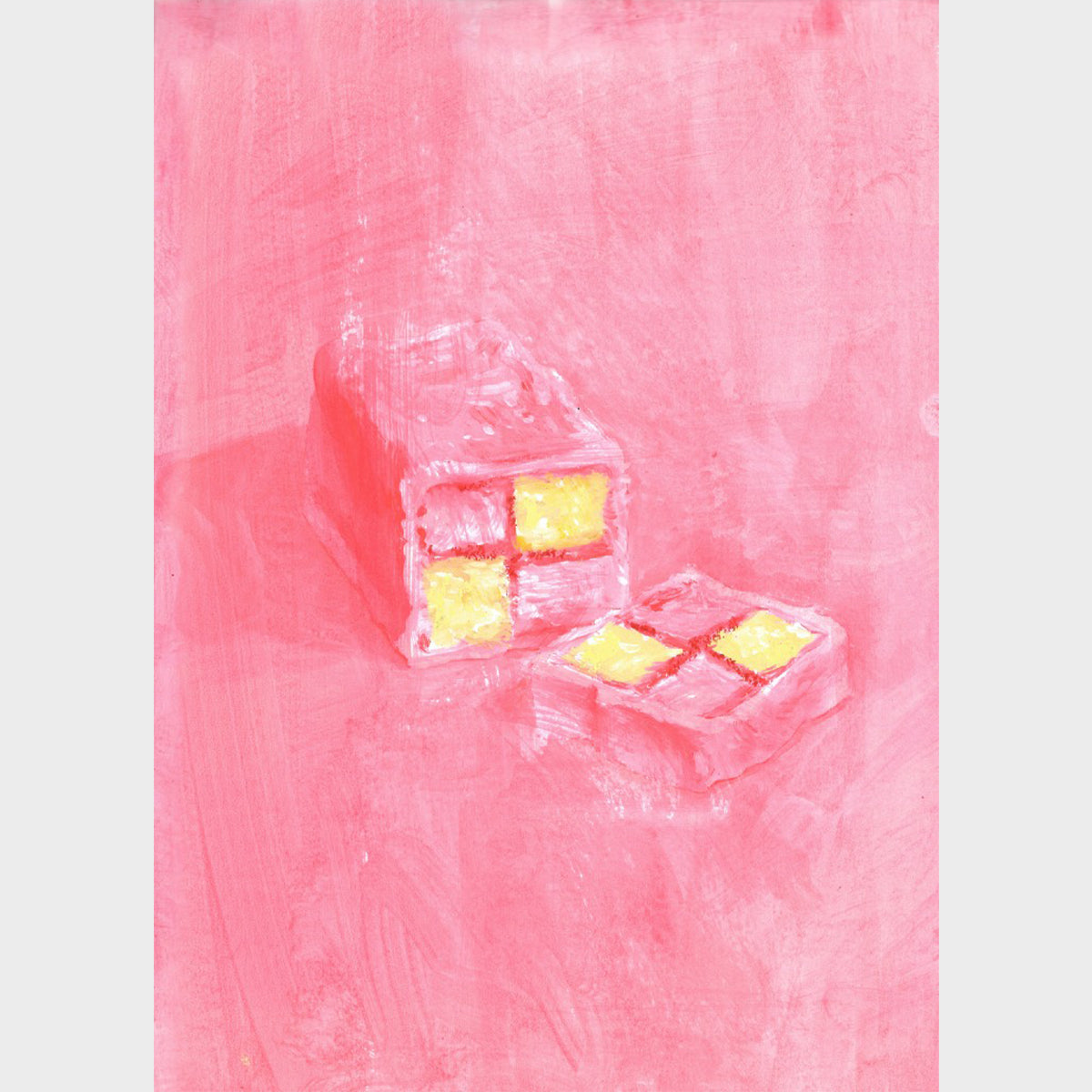 In 2017 Furr created a series of monoprints in four different handpainted colourways for sale at the Art Car Boot Fair in London. They all use the first Battenberg painting as the source image. The work depicts a supermarket bought battenberg displayed on a bright pink painted background with two highlighted yellow windows of sponge. The jam is picked out in red oil pastel.
