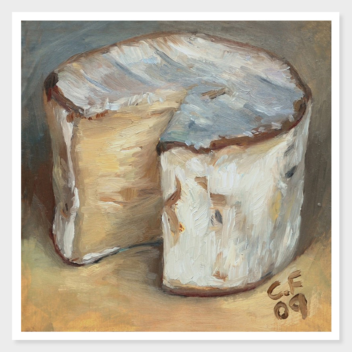 Coming out of his interest in the still life genre, Furr’s first cheese painting was ‘Finn’ in 2009. It is a painting of a delectable British artisan cheese made by Charlie Westhead in Glasbury on Wye.